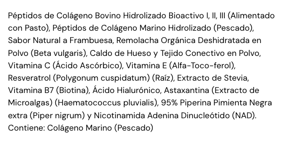 - 🐟 Péptidos de Colágeno Hidrolizado Marino: Hidrata, suaviza y rejuvenece la piel, ayudando a reducir arrugas y líneas de expresión.